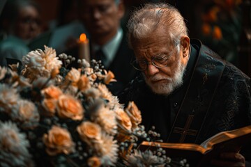 Somber Elderly Man Reading Book by Candlelight Surrounded by Floral Arrangements During Intimate Evening with Atmospheric LightingGrief
