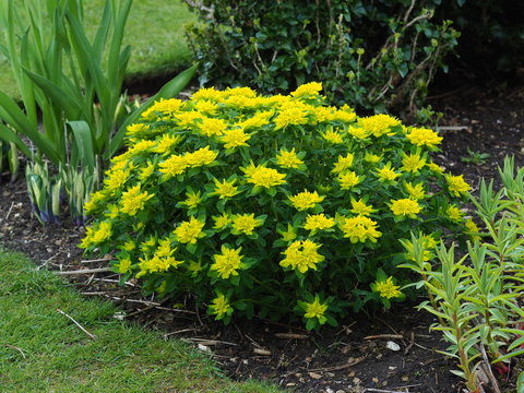 Euphorbia polychroma plant with yellow flowers and green leaves in a garden