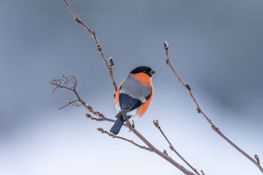 Eurasian bullfinch, Pyrrhula pyrrhula. The male sits on a branch and eats maple seeds