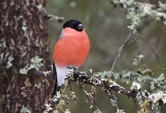 Eurasian bullfinch perched on a mossy branch in winter