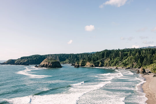 Beach near Eureka, California. Sunny day, bright blue ocean with waves