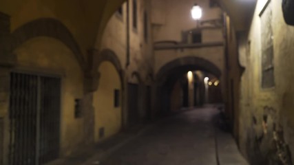 Narrow medieval street with ancient architecture and warm lamps lighting the old town at night in Europe