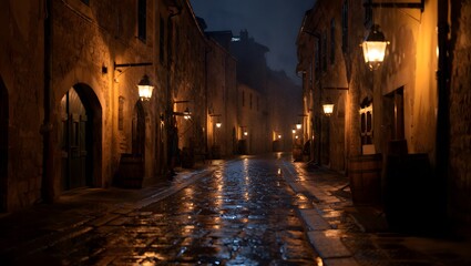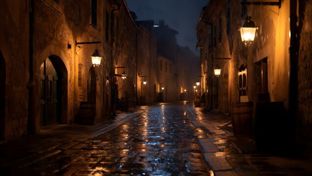 Narrow medieval street with ancient architecture and warm lamps lighting the old town at night in Europe