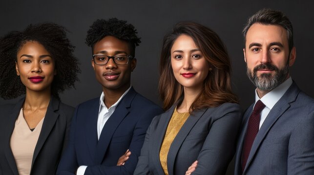 Strong confident professional group of business persons standing outside. Caucasian team of young male and female business executives. Finance, real estate or construction industry concept