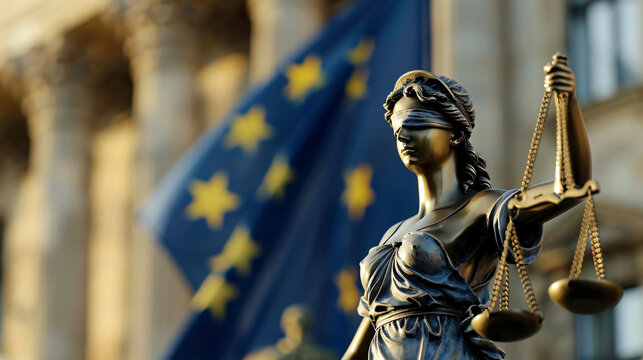 EU flag behind judge s wooden gavel in 3D representation Regional judiciary