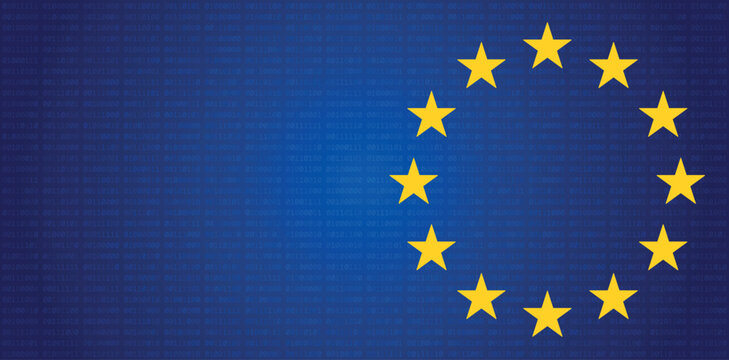 European Union flag waving against urban skyline. Official European Union flag flutters on flagpole, symbolizing union of member states in Europe. European Union flag represents unity of purpose.