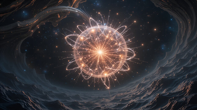 ethereal antiparticle floats in cosmic void, surrounded by swirling energy waves and luminous particles, creating deep cosmic landscape filled with faint stars and nebulas