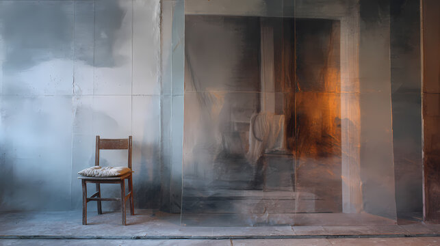 moodboard for choreographed routine | domestic void in formal stillness | evacuated memory | smoky lead and copper grey | frame-in-frame with absence | imprint of absent figure on cushion | shifting