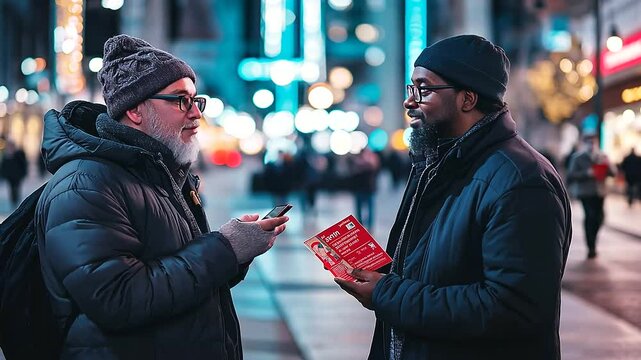 A street evangelist offering a Gospel tract to a friend, their eyes meeting with kindness and sincerity, while the city lights softly illuminate the scene.