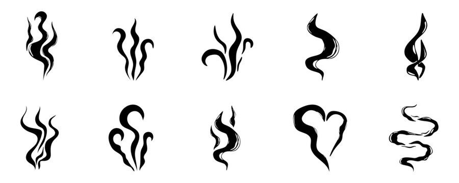Steam smoke hand drawn line comic doodle. Aroma trail, cloud or wind silhouette. Smells hot air fragrance evaporate set.