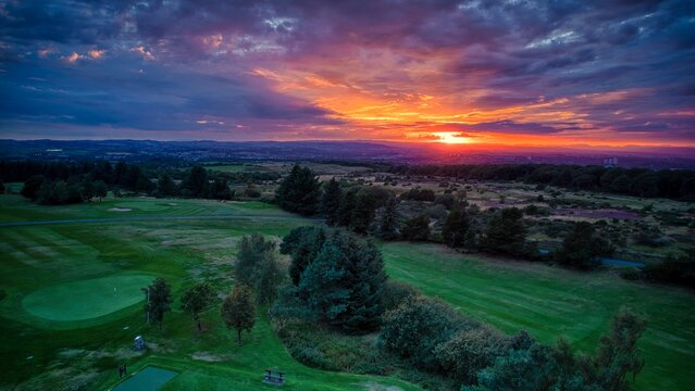 Beautiful dark night view of the golf course, Bunkers sand and green grass, garden background In the light of the spotlight underexposure view.