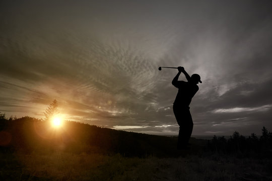Hand asian woman putting golf ball on tee with club in golf course on evening and sunset time a for healthy sport.  Lifestyle Concept.