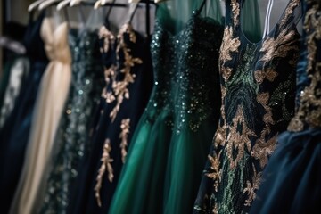 The luxury boutique offers fashionable formal dresses. Elegant dresses in a variety of textures and colors for partygoers, exuding timeless beauty and style.