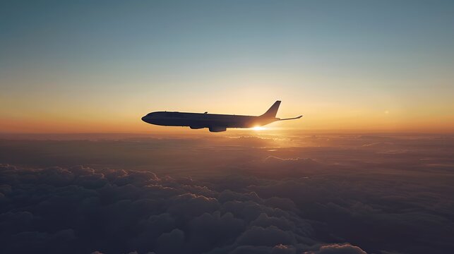 Witness a stunning sunset as an airplane soars above the clouds during a serene evening flight in the sky