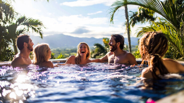 Friends enjoying a lively gathering in a hot tub with a scenic view during sunset in a tropical location