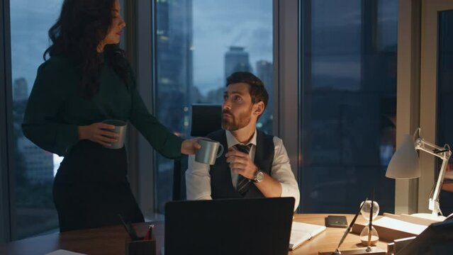 Blurred figures working late in modern office interior with glass walls, city nightscape, evening
