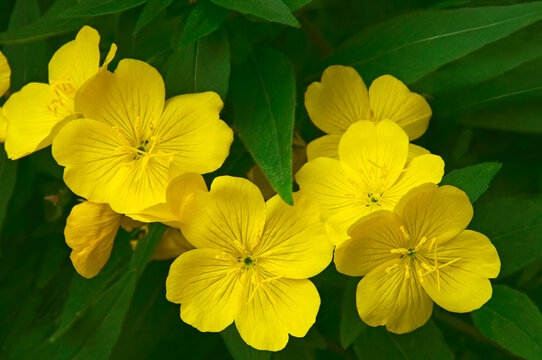 Common Evening primrose (Oenothera biennis). Called Evening star, Sundrop, Weedy evening primrose, German rampion, Hog weed and Fever-plant also