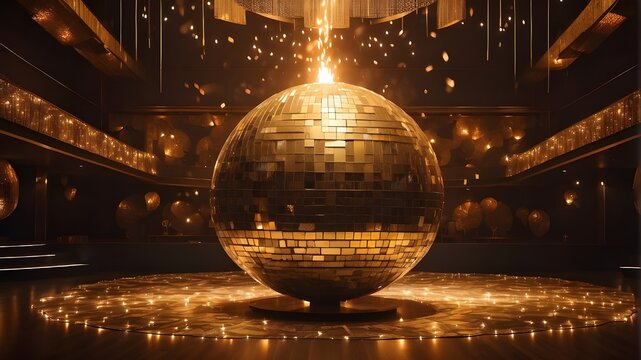 A flaming light show surrounds a golden disco ball, preparing the audience for an opulent evening of celebration.