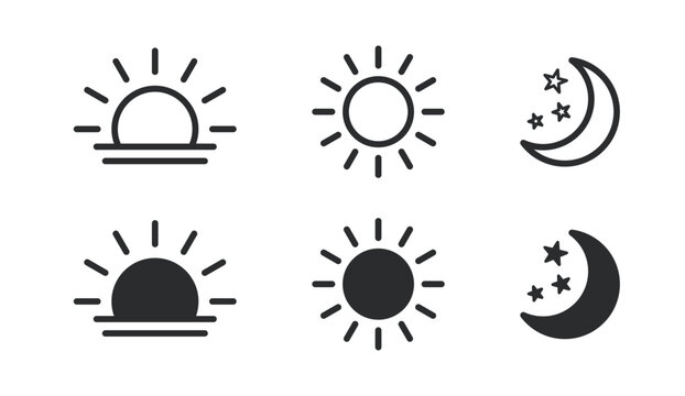 Time of the day icons showing morning sunrise, bright noon sun, evening sunset, and night moon with stars representing daily cycle, weather, astronomy, calendar, and environment concept