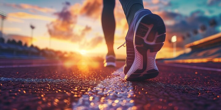 Experience the urban ambiance of evening runs in the rain through a close-up shot of runner's shoes on a wet street, reflecting the city lights at night.