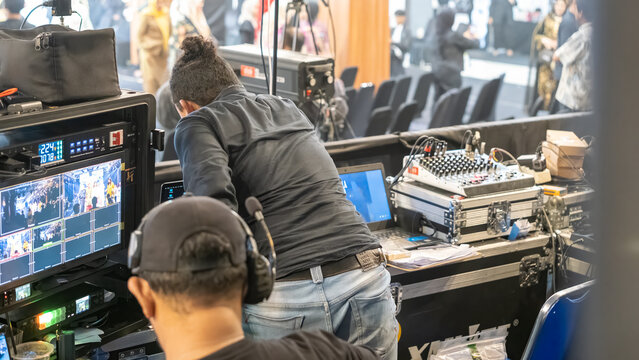 Backstage production team operating broadcast monitors and audio mixer during live event to manage video, sound, and recording.
