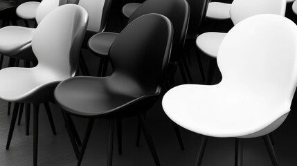 Empty black and white chairs arranged for an event creating a modern minimalist aesthetic in a spacious venue setting