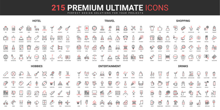 Travel, entertainment event and shopping, bar drinks thin line red black icons set vector illustration. Abstract symbols of retail shop and hotel hospitality, hobby simple design for mobile, web apps
