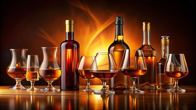 Elegant Set of Cognac Illustrations Featuring Varied Glasses and Bottles Perfect for Beverage Menus, Bar Decor, and Culinary Designs with Ample Copy Space for Custom Text