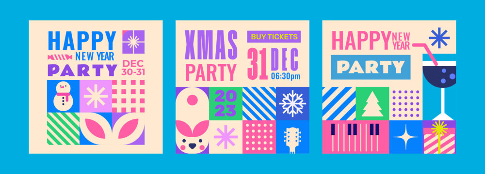 3 trendy winter festival or party templates. Set of backgrounds, greeting cards, posters, holiday covers with New Year's icons in mosaic style.t