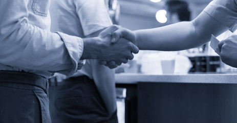 Event planner and investor presentation attendee talking. Business manager meeting coordinator host greeting seminar people. Focus on shirt pocket of businessman receiving a business card.