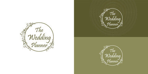 Wedding planner, and wedding organizer logotype design presented with multiple background colors. Simple and elegant wedding planner company logo with circle flower decoration