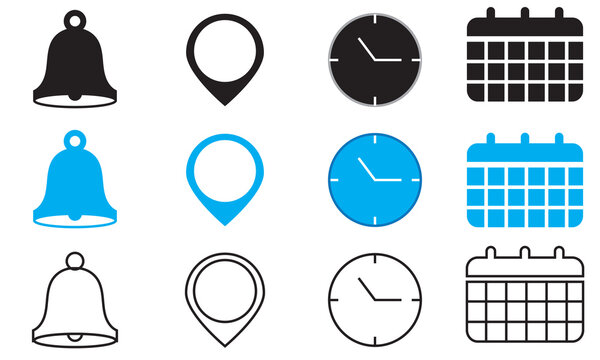 Notification, location, time, and calendar icon. Collection of colorful and outline icons showing bell, map pin, clock, and calendar symbols used for reminders, scheduling, and navigation.