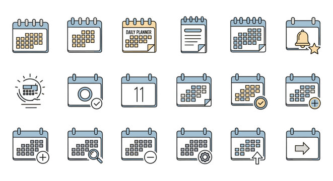 A collection of flat line icons representing various calendar functions and concepts, including daily planners, event reminders, date selection, adding events, searching, and scheduling, presented on