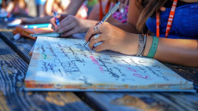 Close-up of Hand Writing on Sign-In Sheet with People in Background at Outdoor Event