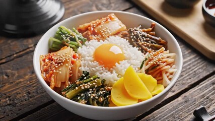 A bowl of bibimbap with rice, egg, vegetables, and pickled ginger on a wooden table