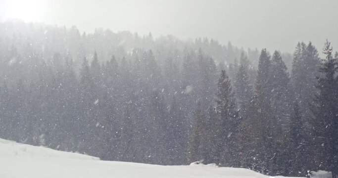 Snow falling in mountain forest. Natural winter landscape with snowy spruce forest, white snowdrifts. Heavy snowfall in cold woodland nature. Snowing climate. Pine forest in snowy weather. 4k
