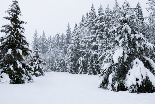 Snowy winter landscape with evergreen trees
