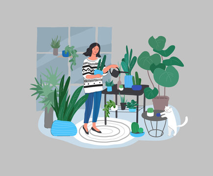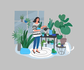 Girl caring for house plants in urban home garden with cat. Daily life and everyday routine scene by young woman in scandinavian, style cozy interior with homeplants. Cartoon vector
