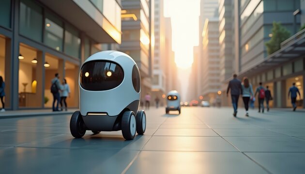Autonomous delivery robot on big city street. Convenience and efficient nature of technology. Concept of technological advancement and positive impact of robotics on everyday urban life