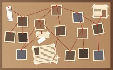 Detective office interior element. Wall board, wits and deduction system. Crime and criminal evidence. Vector flat style cartoon illustration isolated on white background