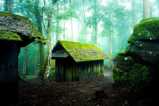 Abandoned military wooden house in the deep jungle, surrounded by morning environment light and freshness. Travel hidden location photo.