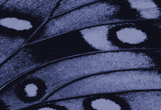 Abstract close up of a textured blue and purple pattern featuring curved lines, circular forms, grainy surface texture, and atmospheric wave-like motifs evocative of fabric