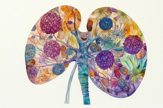 Liver in watercolor with a subtle overlay of cancer cells, combining medical detail with artistic softness, evoking concern and awareness