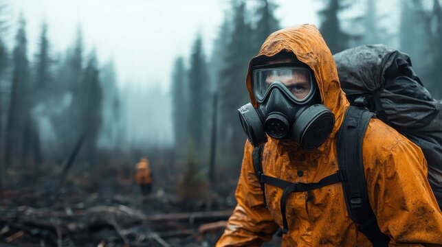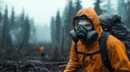 A lone figure in an orange raincoat and gas mask stands amidst a foggy, desolate forest landscape, evoking themes of survival and environmental concern amidst nature's beauty.