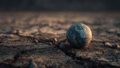 A weathered, blue-toned sphere rests on cracked, arid earth, bathed in soft, warm light; evoking themes of fragility and environmental concern