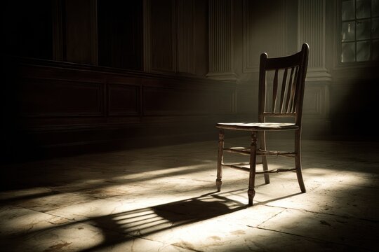 A solitary empty chair in a dim courtroom, harsh overhead light creating deep shadows, evoking a sense of anticipation and justice