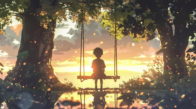 nostalgic anime scene of a young boy sitting alone on a park swing evoking childhood memories and emotions digital illustration