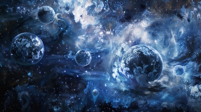 Celestial bodies and cosmic phenomena in deep blue and silver evoking savings