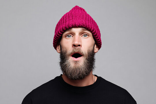 bearded hipster in hot pink knit hat making exaggerated surprised face