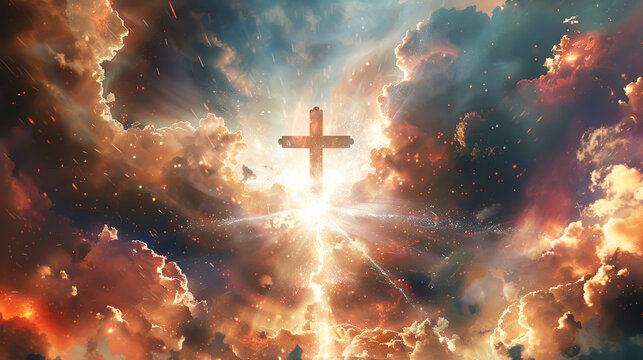 Shining cross emitting divine golden light in the sky with menacing clouds, mystical atmosphere. Concept of Faith and Spirituality, Easter, Exaltation, religious holidays. Horizontal frame